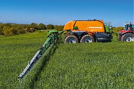 Das hydropneumatische Fahrwerk liefert in Verbindung mit der gefederten Hitch-Deichsel den perfekten Fahrkomfort. Die BPW-Achsaggregate mit der serienmäßigen Niveauregulierung passen sich permanent dem Beladungszustand an. Die Hitch-Deichsel ermöglicht durch ihre hohe Stützlast von 3 t in Verbindung mit der Zugkugelkupplung (K80) eine hohe Traktion des Traktors und einen ruhigen Lauf der Maschine. Da die Federungszylinder über Kreuz miteinander verbunden sind, ist die Maschine sehr wankstabil. Das geschlossene Hydrauliksystem sorgt für eine immer gleiche Lastverteilung auf alle 4 Räder. Mögliche Spurweiten liegen zwischen 2,00 bis 2,25 m und der Raddurchmesser kann bis zu 1,95 m betragen.