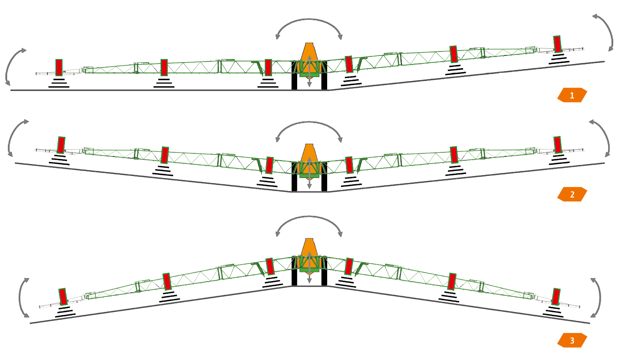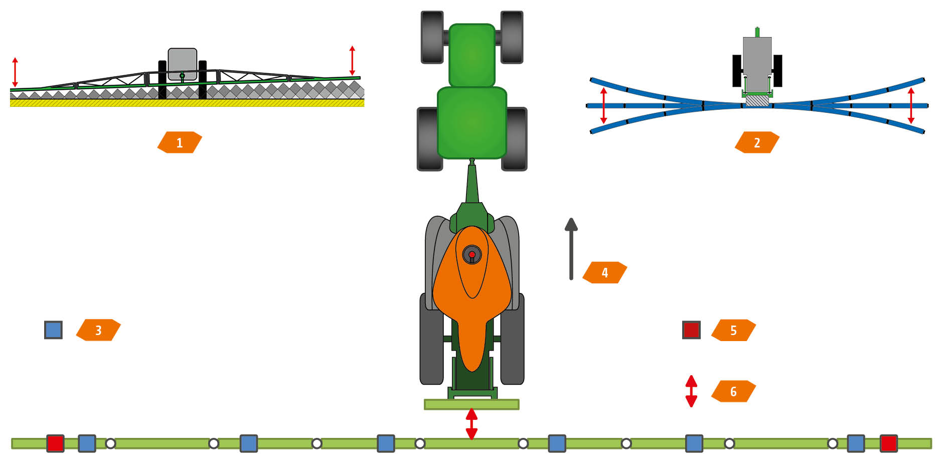 Basis der neuen Gestängeführung ist ein schnell agierendes Hydrauliksystem und 4 Sensoren bzw. in Kombination mit Flex-Klappung 2 sogar 6 Sensoren, die ein automatisches Anwinkeln und Abwinkeln ermöglichen.