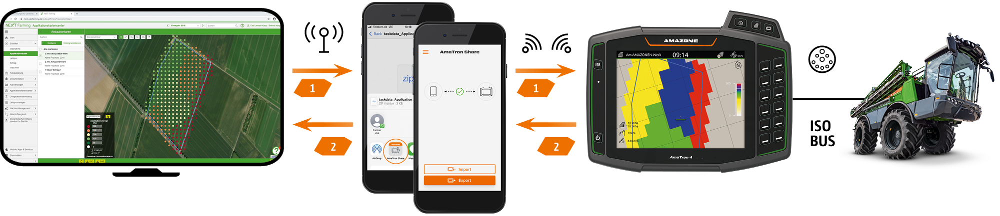 Über die App AmaTron Share, die über WLAN mit dem AmaTron 4 verbunden ist, können alle Daten bequem online übertragen werden. So können mit der App z. B. Applikationskarten einfach vom Büro auf das AmaTron 4 geschickt und abgearbeitet werden. Ebenso können Auftragsdaten nach der Arbeit als PDF-Dokumentation per Cloud, E-Mail oder Messenger-Diensten wie WhatsApp an die Kunden oder zurück ins Büro geschickt werden. Das ist komfortables Datenmanagement.