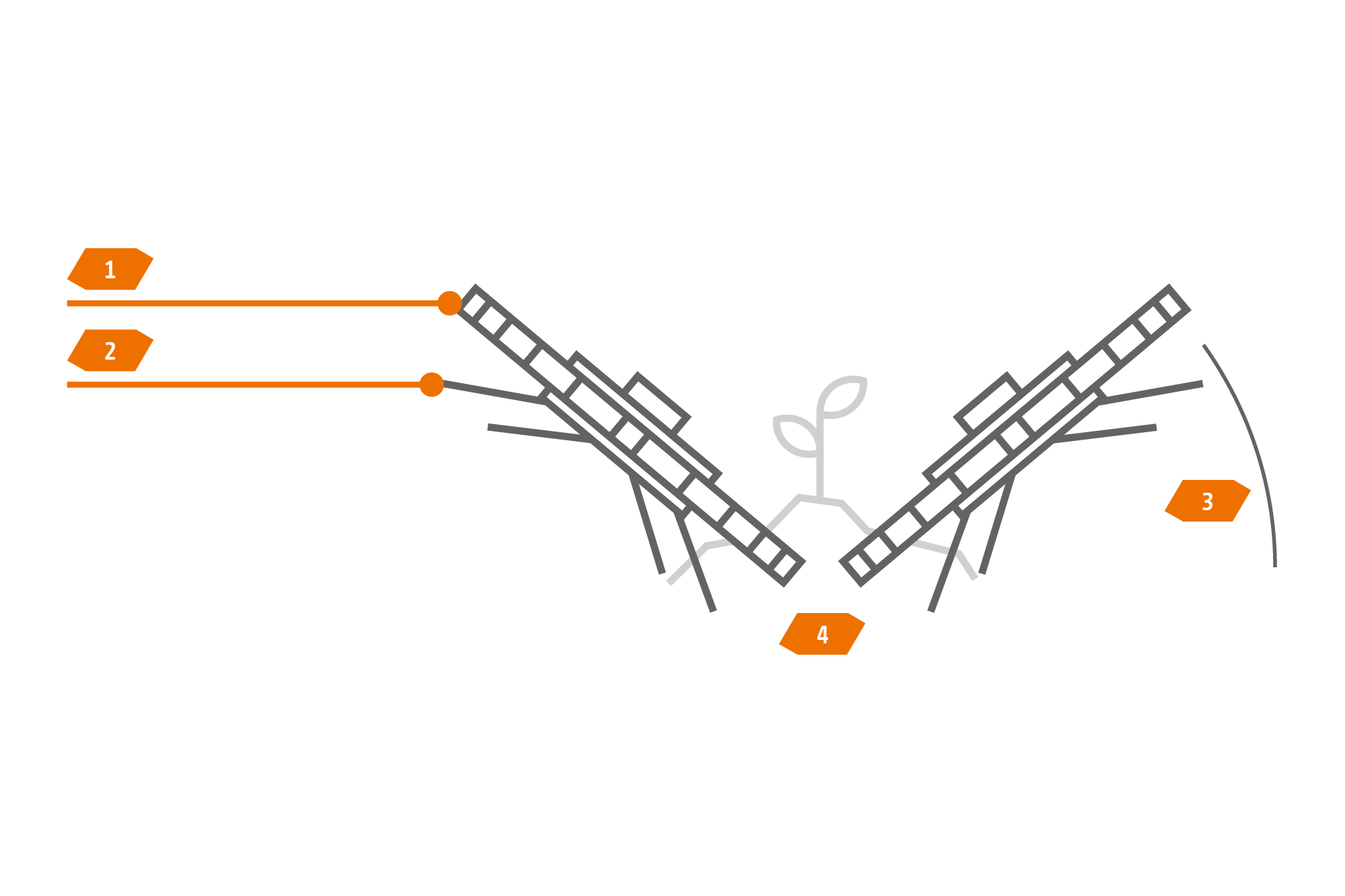Die Fingerhacke der Venterra kann in ihrer Neigung eingestellt werden, um die Aggressivität der Fingerräder an die Größe der Nutzpflanze anzupassen. Für junge und empfindliche Bestände empfiehlt sich ein Einstellwinkel von 40° im 1. und 2. Hackgang. Dabei ist die Umlaufgeschwindigkeit der Fingerräder geringer, wodurch diese schonender arbeiten.