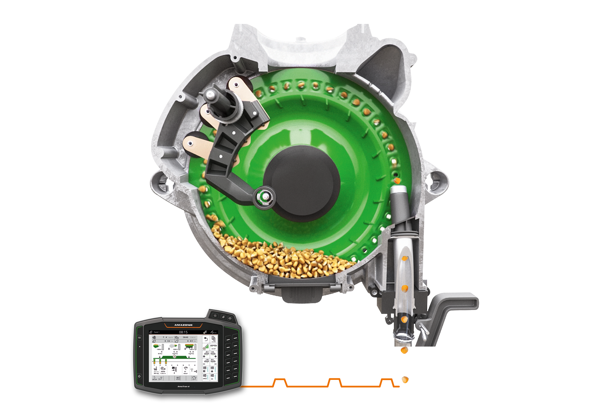 Der Herzschlag der Precea – das Schießen des vereinzelten Korns – wird mittels Infrarotsensor des Optogeber registriert und als Signal in das AmaTron 4 übertragen. Hier wird es z. B. für die intelligente Abstreifereinstellung SmartControl verarbeitet.