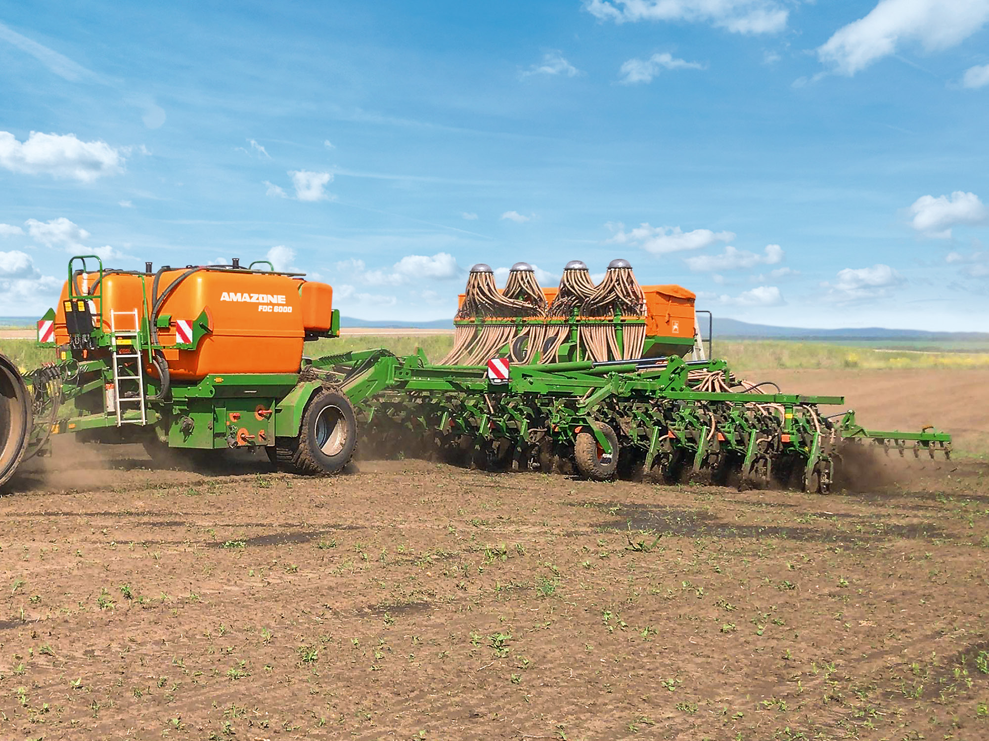 AMAZONE hat speziell für die Standorte des Trockenfeldbaus ein Fertiliser Delivery Cart FDC entwickelt, welches in Kombination mit der Sämaschine Primera DMC, der Sämaschine Condor oder der Einzelkorn-Sämaschine EDX genutzt werden kann. Das Cart wird dabei zwischen Traktor und gezogener Sämaschine gehängt. Über eine Pumpe mit Reibradantrieb wird der Flüssigdünger zu den Säscharen gefördert, die den Dünger in den Boden einbringen. Diese Kombination wird eingesetzt, um die Saat und die Startdüngung mit einer Überfahrt zu erledigen. Die Flüssigdüngung direkt bei der Saat fördert das Jugendwachstum und spart eine zusätzliche Überfahrt. Die Ausbringung granulierter Dünger stößt in diesen trockenen Gebieten an ihre Grenzen. Der Flüssigdünger steht den jungen Pflanzen gleich zu Beginn der Wachstumsphase voll zur Verfügung.