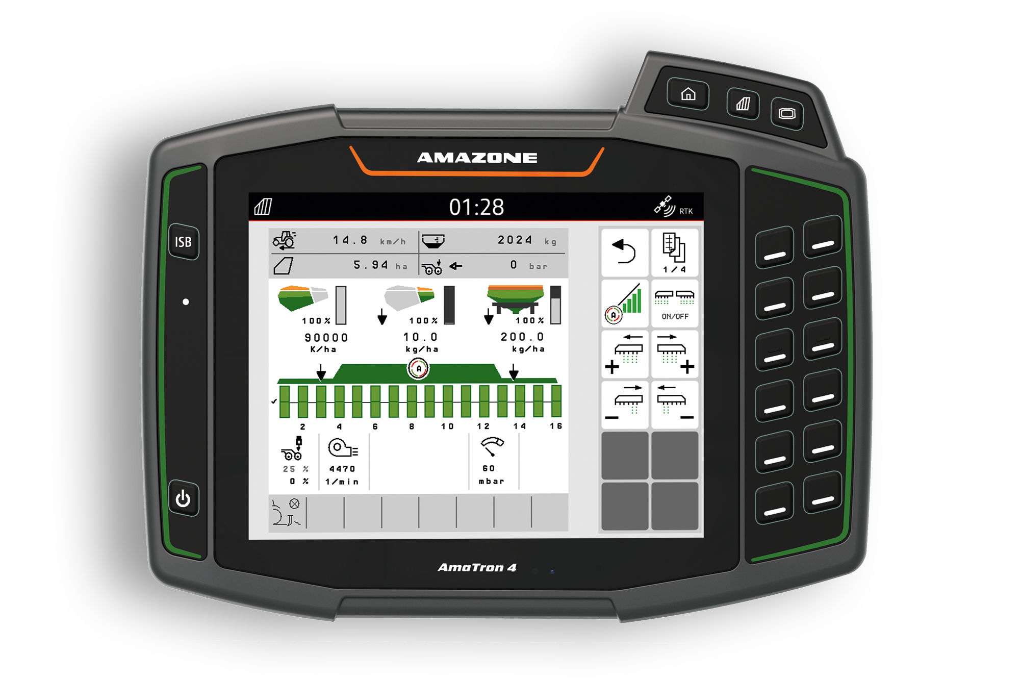 Für weitere SmartFarming-Anwendungen, wie die teilflächenspezifische Ausbringung von Dünger oder Saatgut, eine Einzelreihenschaltung für jedes Medium oder auch die individuellen Schaltzeitpunkte jedes Ausbringorgans, bedarf es eines ISOBUS-Bedienterminals, das diese Funktionen unterstützt: das AmaTron 4.