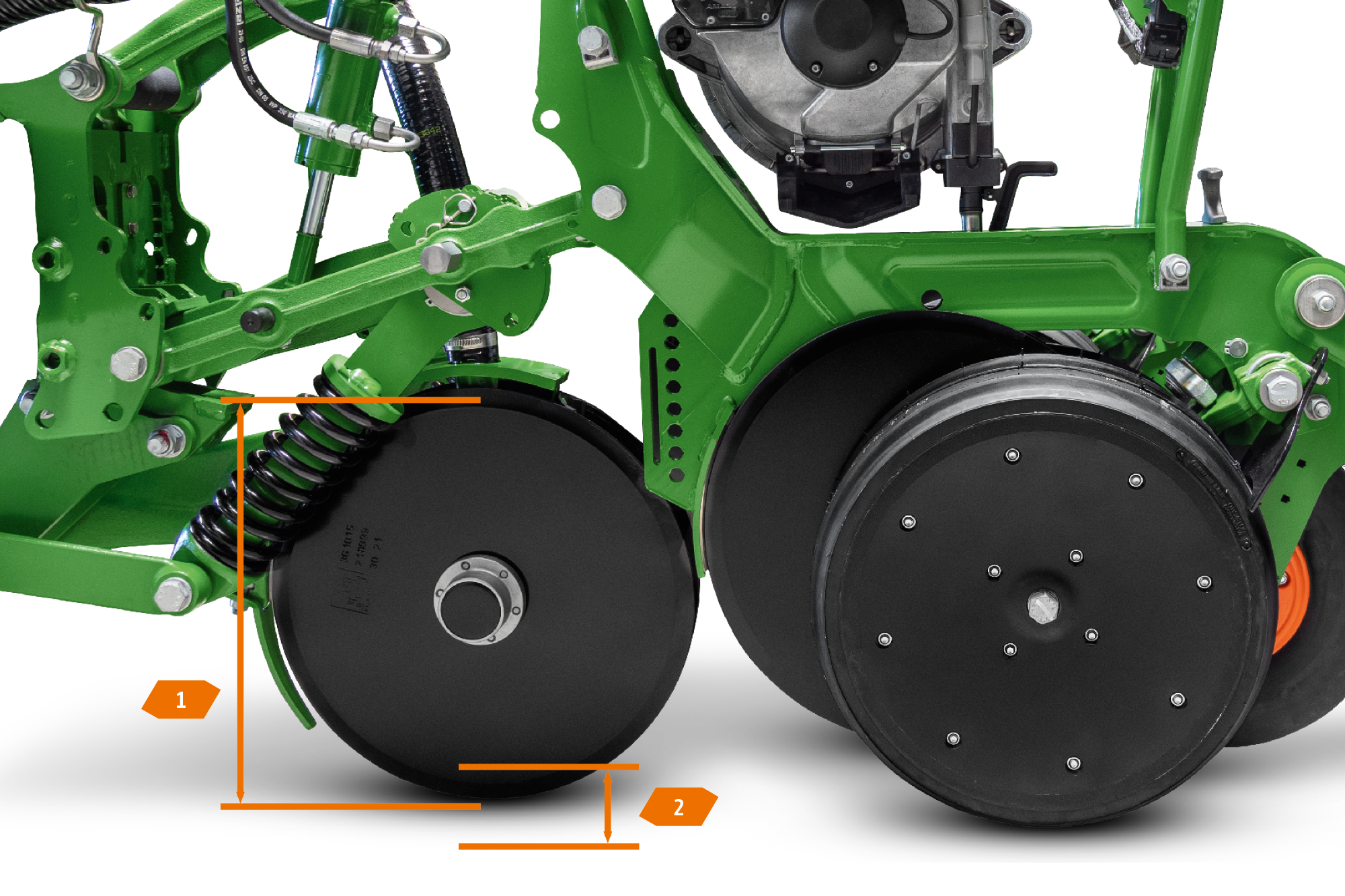 Das leistungsfähige Doppelscheibenschar sorgt für eine saubere und zuverlässige Ablage. Laufruhig legt das Doppelscheibenschar den Dünger vor dem PreTeC-Mulchsaatschar ab. Das Doppelscheibenschar ist komplett wartungsfrei und erfüllt die höchsten Ansprüche, vor allem des Bedienkomforts. Einmalig wird das Delta der Ablagetiefe des Düngers zur Ablagetiefe des Saatguts eingestellt. Wird die Sätiefe anschließend geändert, stellt das Düngerschar die Tiefe automatisch nach.