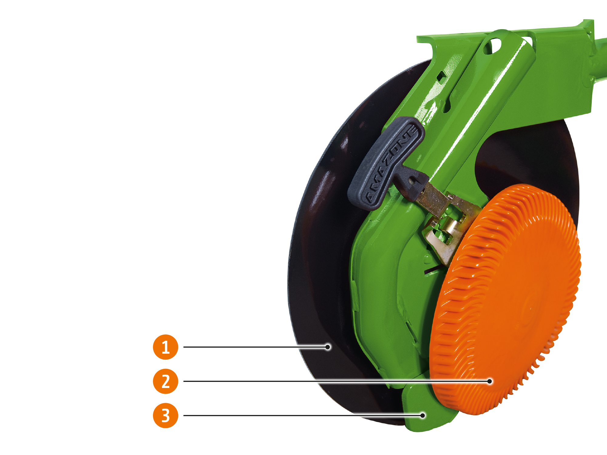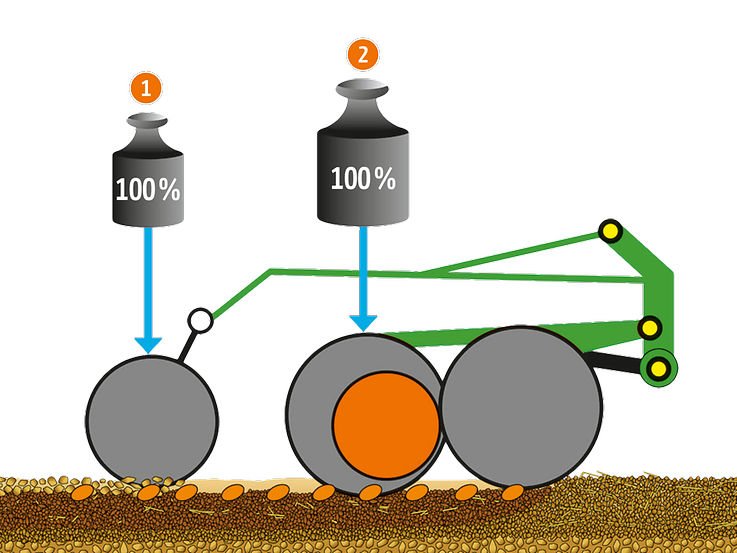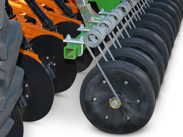 Die sehr gleichmäßige und exakt kontrollierte Tiefenführung des RoTeC-Control-Schars wird über die Tiefenführungsscheibe Control 10 mit einer 10 mm breiten Aufstandsfläche oder die Tiefenführungsrolle Control 25 mit einer 25 mm breiten Aufstandsfläche erreicht. Da diese Tiefenführung direkt seitlich am Schar angebaut ist, arbeitet dieses Prinzip genauer als Scharsysteme mit nachgelagerter, fest verbundener Tiefenführungsrolle. Mit den Tiefenführungsscheiben oder -rollen erfolgt die Grundeinstellung der Sätiefe schnell, einfach und komfortabel über Schardruck. Gegebenenfalls kann mit einem Rasterverstellsegment am Säschar in 3 Einstellstufen werkzeuglos nachreguliert werden.