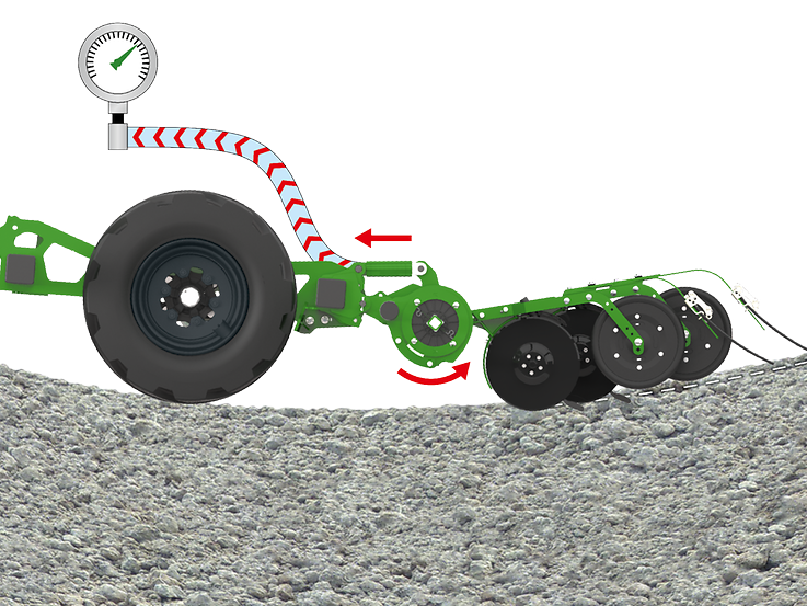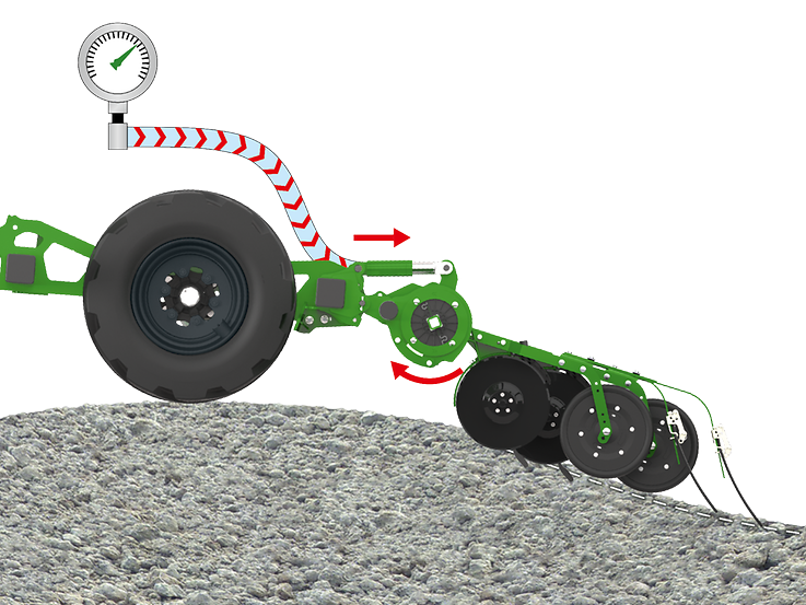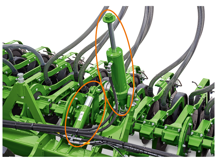 Aufgrund des hohen Schardrucks des TwinTeC plus-Doppelscheibenschars ist die Saat auch unter Mulchsaatbedingungen mit einem hohen Anteil organischer Substanz im Saatbett sehr präzise. Dank der innovativen Schardruckverstellung im Ölumlauf bleibt der Schardruck auch in stark kupiertem Gelände konstant, sodass die eingestellte Sätiefe sicher gehalten wird. Ebenso kann der Schardruck teilflächenspezifisch über Applikationskarten eingestellt werden.