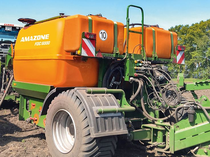 Das Gewicht wird über die beiden großen Reifen 800/45/26,5 optimal auf dem Boden verteilt, sodass der Boden geschont wird. Der Traktoranbau des gezogenen Flüssigdünger-Carts erfolgt je nach Bedarf über eine Unterlenkeranhängung der Kat. 3, 4 oder K700, über eine Zugöse oder einen Kugelkopf, ebenso wie auf der Rückseite, an der die gezogene Sämaschine angekuppelt wird.