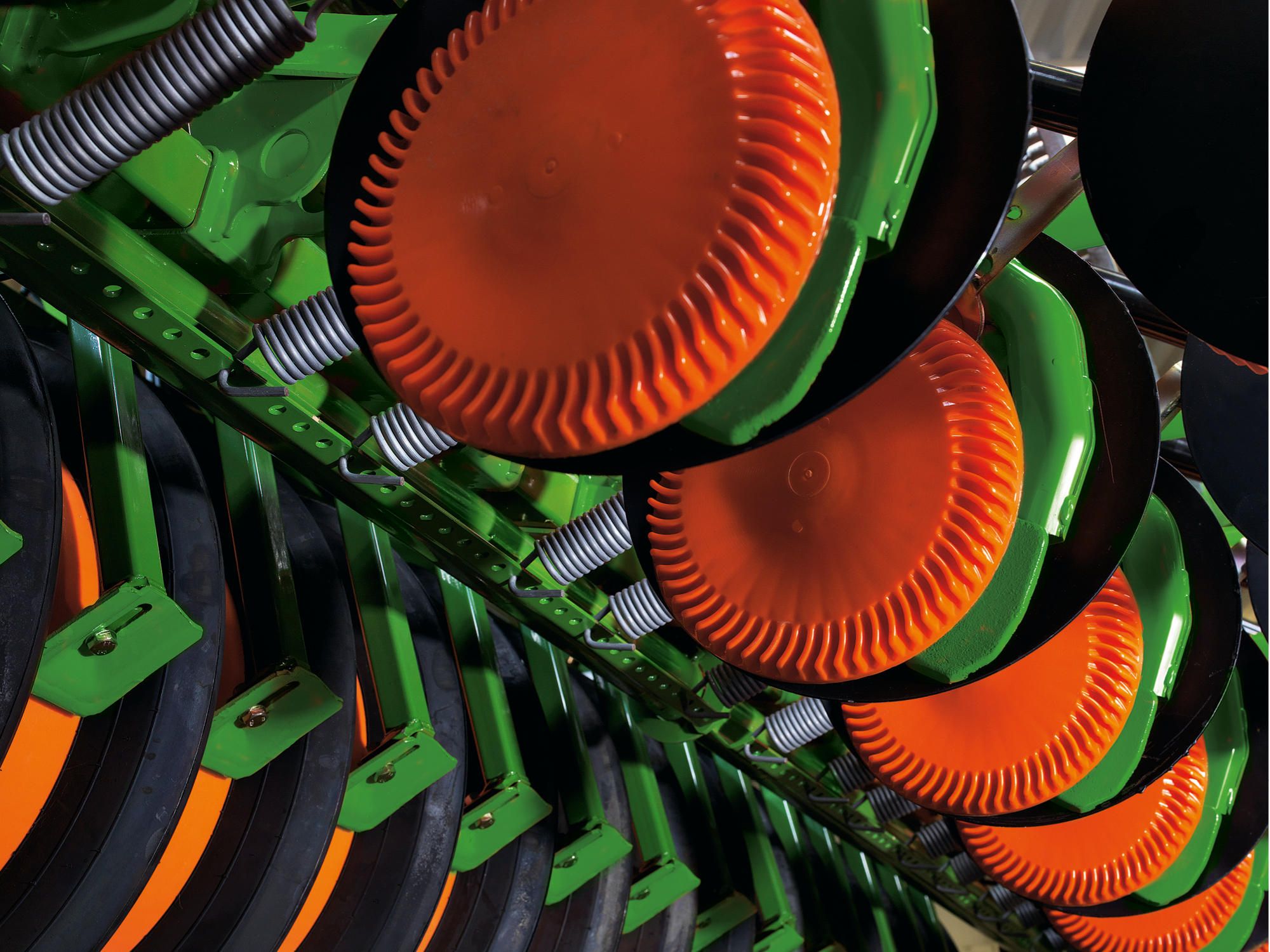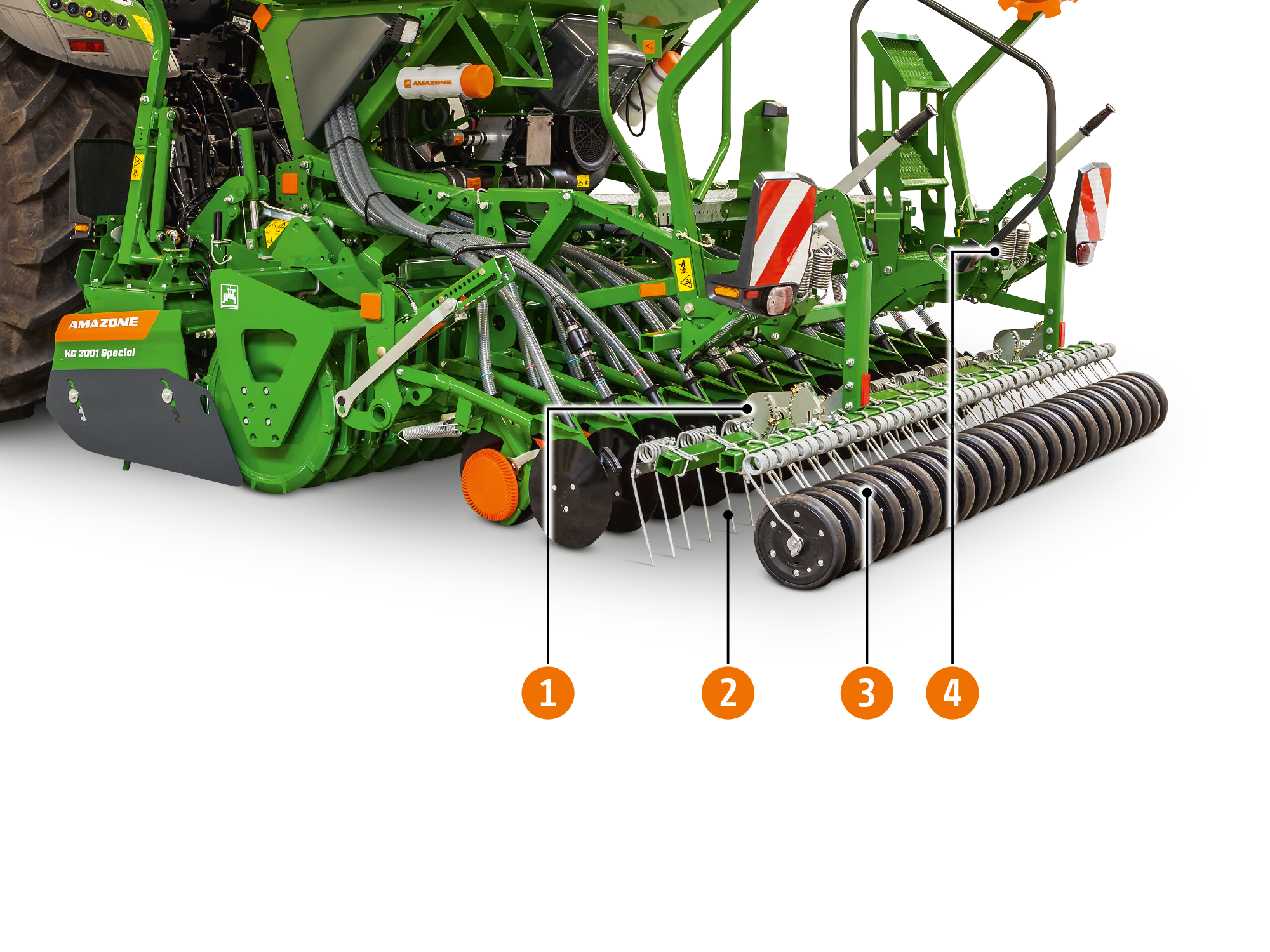 Die 3-reihige Anordnung und der große Scharschritt geben Sicherheit gegen Verstopfungen im Scharbereich. Ein Führungstrichter im Schar leitet die Saat exakt bis hinter die Scharspitze. Die Scharstütze verhindert das Verstopfen des Scharauslaufes beim Absetzen der Maschine.