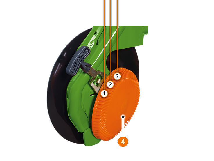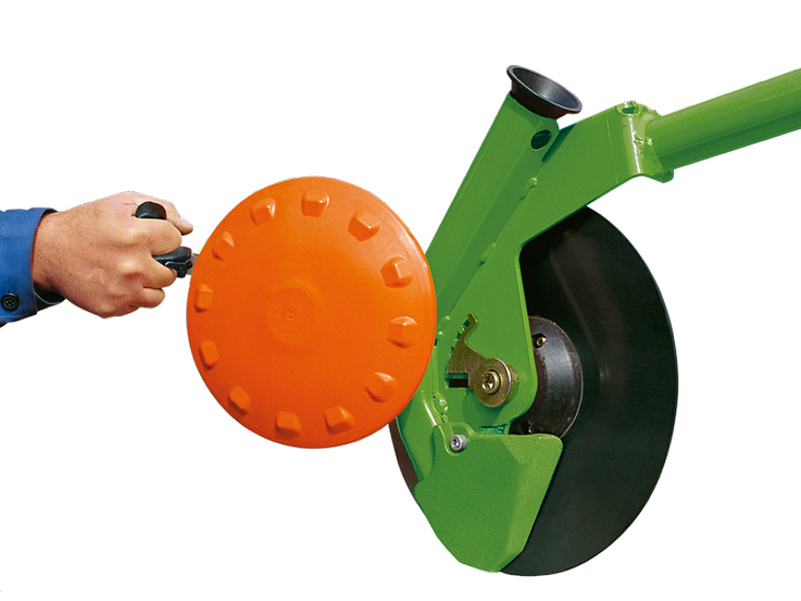 3. Tiefenführungsscheibe Control 10 oder Tiefenführugsrolle Control 25 für eine gleichmäßige Tiefenführung. Das Tiefenführungselement reinigt dabei die Säscheibe aktiv während des Einsatzes.