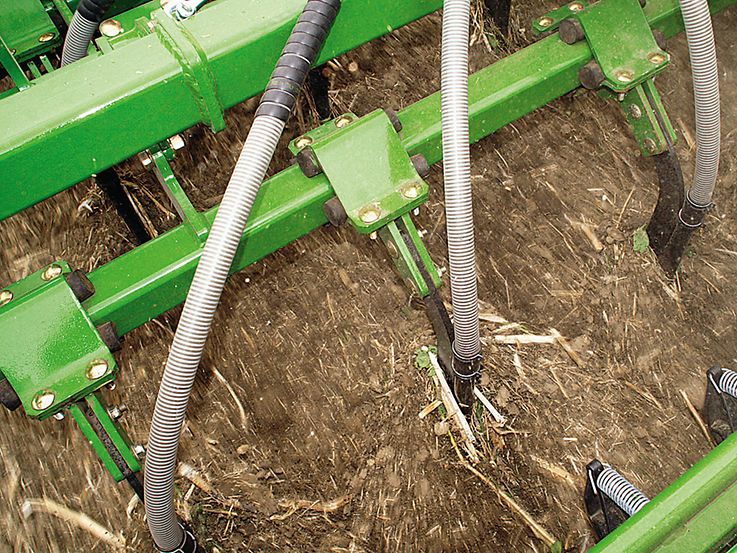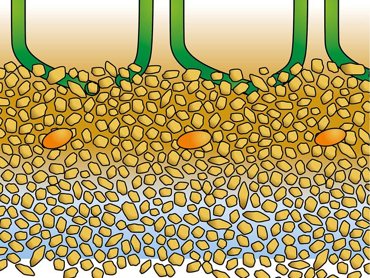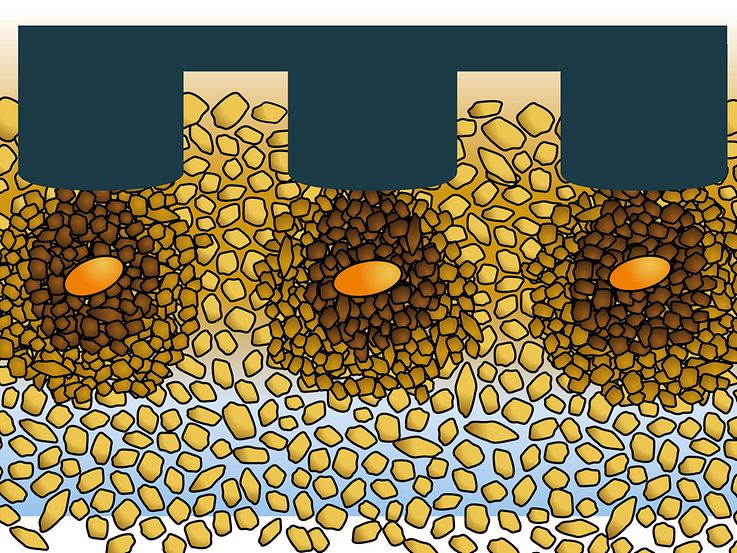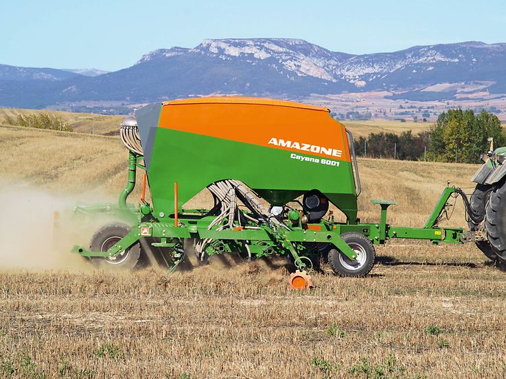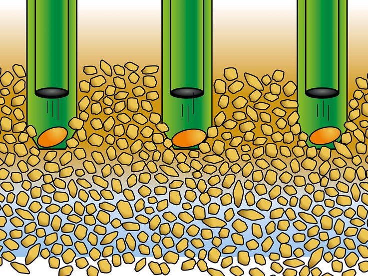 Die schmalen TineTeC-Schare der Cayena „stehen auf Griff“ und ziehen sich selbsttätig in den Boden ein. Da die Maschine über den Unterlenker des Traktors und die Keilringwalze im Heck abgestützt wird, ist der Einzug der Zinken nach unten begrenzt. So ist – permanent und unabhängig vom Füllstand des Saatgutbehälters – eine exakte Ablagetiefe des Saatguts sichergestellt. Mit zwei halbseitigen Einstellelementen können Sie die Ablagetiefe zentral, schnell und sicher einstellen.