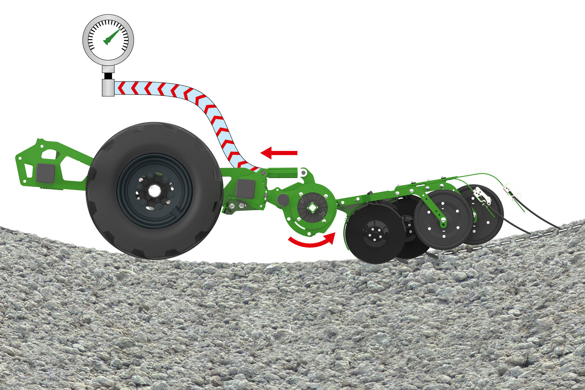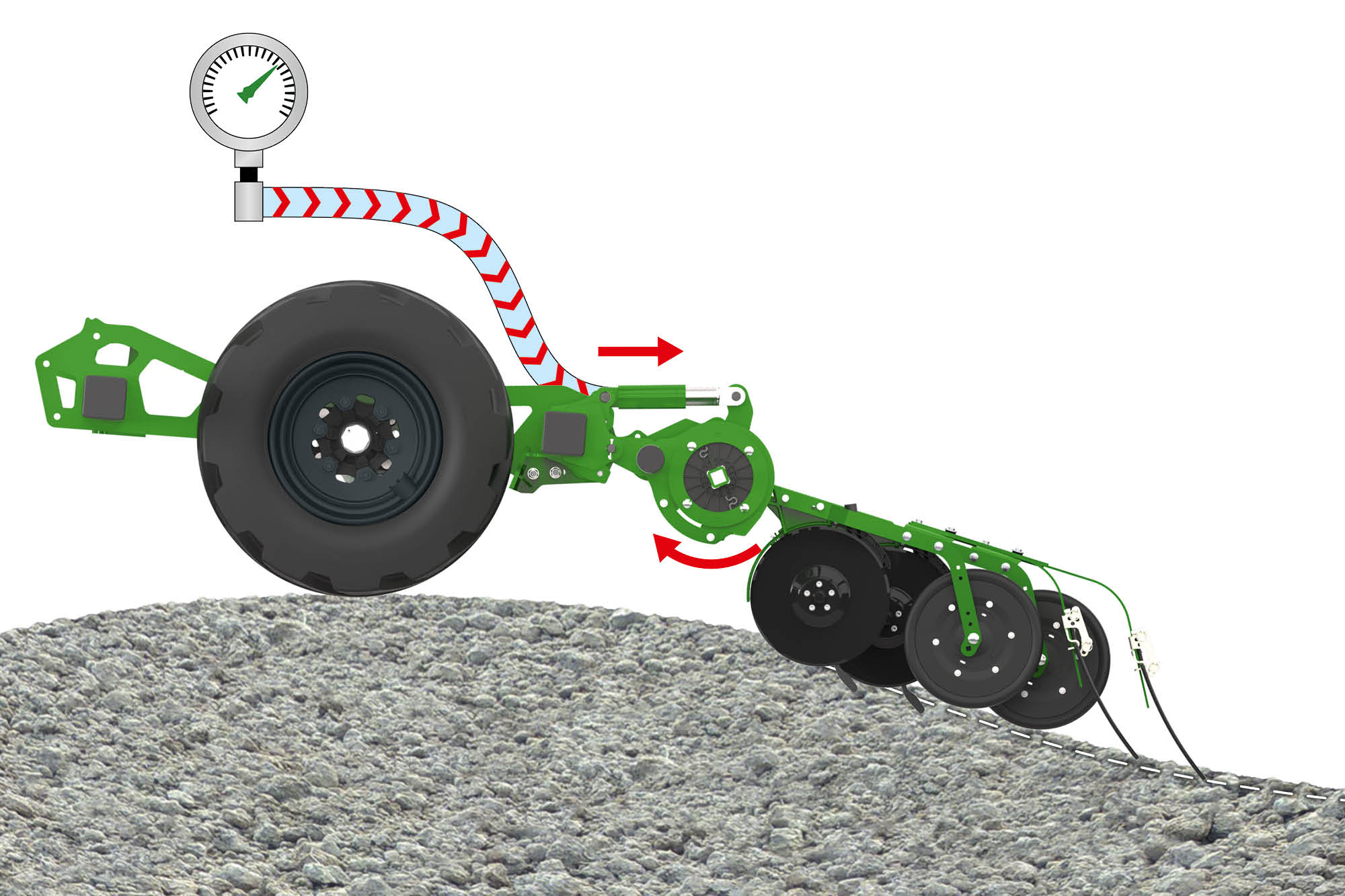 Senke: Bei der Durchfahrt einer Senke werden die Schare zusätzlich gegen den Boden gepresst. Das erzeugt einen Überdruck im Schardruckzylinder der direkt in den Ölkreislauf zurückgegeben wird. Der Schardruck bleibt konstant.