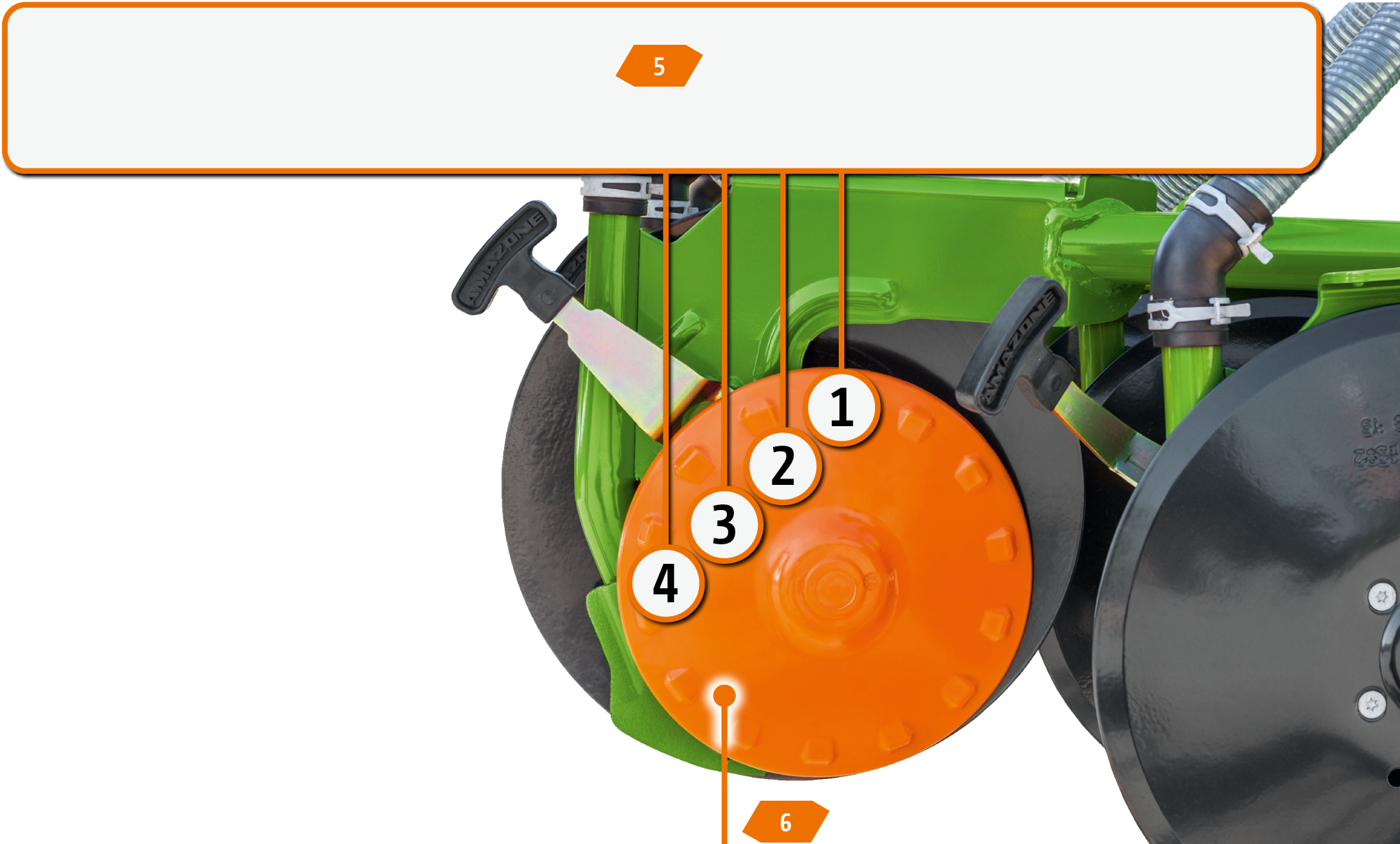 Führungsverlängerung und Saatgutfixierer leiten das Saatgut sicher in den Furchengrund und verhindern ein Verspringen der einzelnen Körner. Der serienmäßige Innenabstreifer, optional auch mit Hartmetallplatten, stellt die exakte Arbeit auch auf klebenden Böden sicher und erhöht die Einsatzsicherheit deutlich.