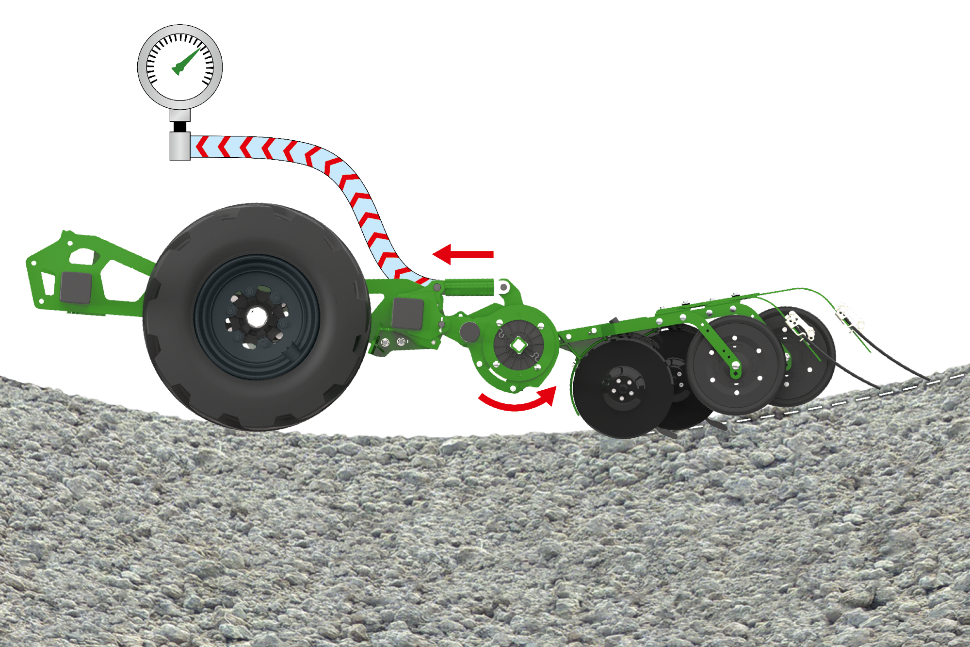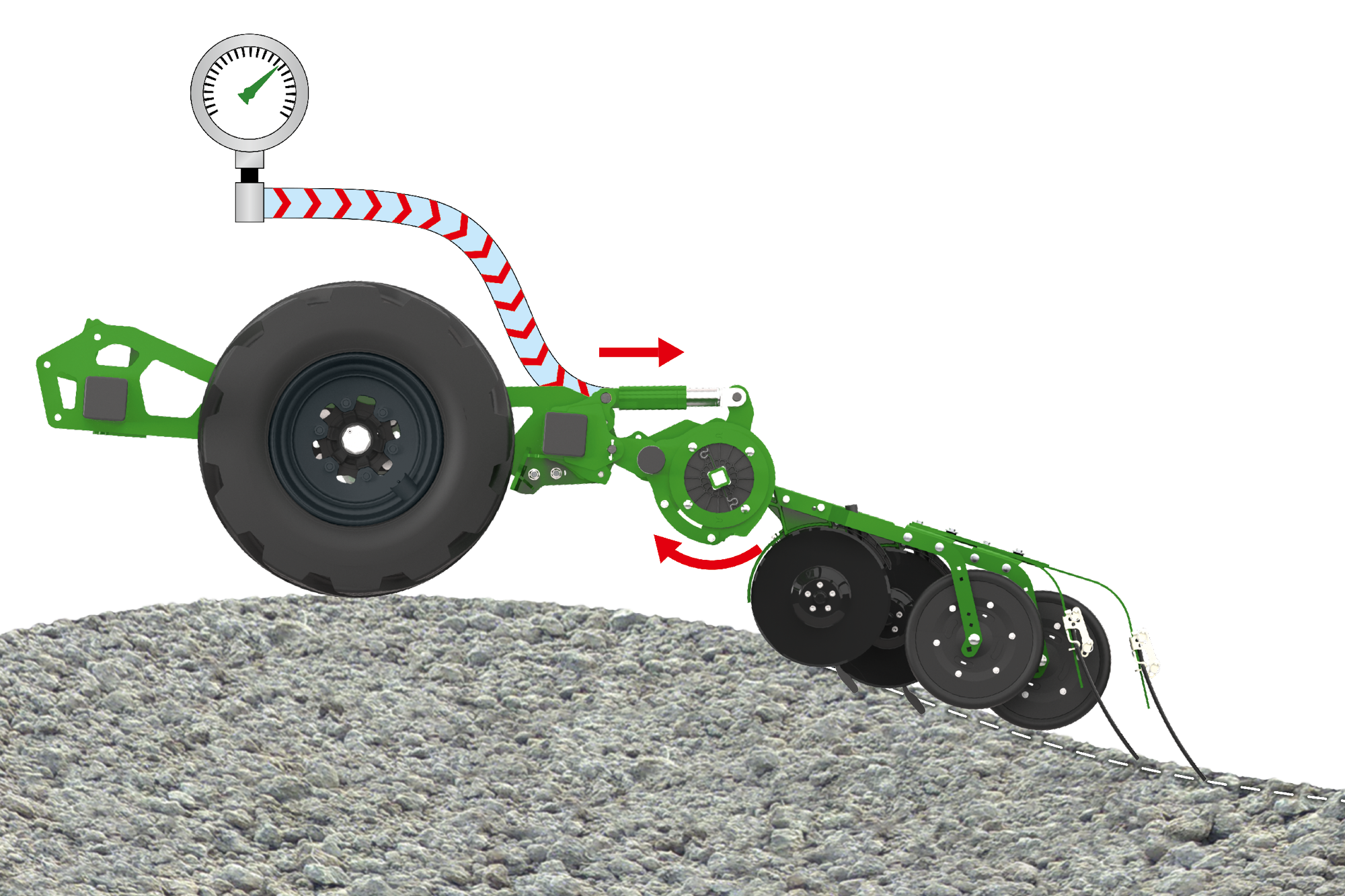 Aufgrund des hohen Schardrucks des TwinTeC plus-Doppelscheibenschars ist die Saat auch unter Mulchsaatbedingungen mit einem hohen Anteil organischer Substanz im Saatbett sehr präzise. Dank der innovativen Schardruckverstellung im Ölumlauf bleibt der Schardruck auch in stark kupiertem Gelände konstant, sodass die eingestellte Sätiefe sicher gehalten wird. Ebenso kann der Schardruck teilflächenspezifisch über Applikationskarten eingestellt werden.