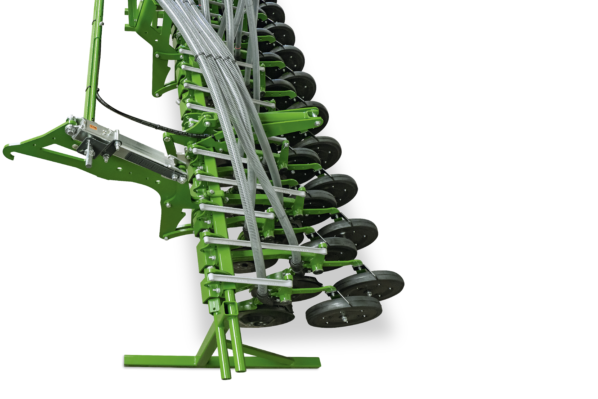 Die Säeinheit der geklappten Maschinen mit Arbeitsbreiten von 4 m bis 6 m lässt sich einfach manuell abbauen und über Stützfüße sicher verstauen. So kann die Bodenbearbeitungsmaschine auch solo eingesetzt werden.