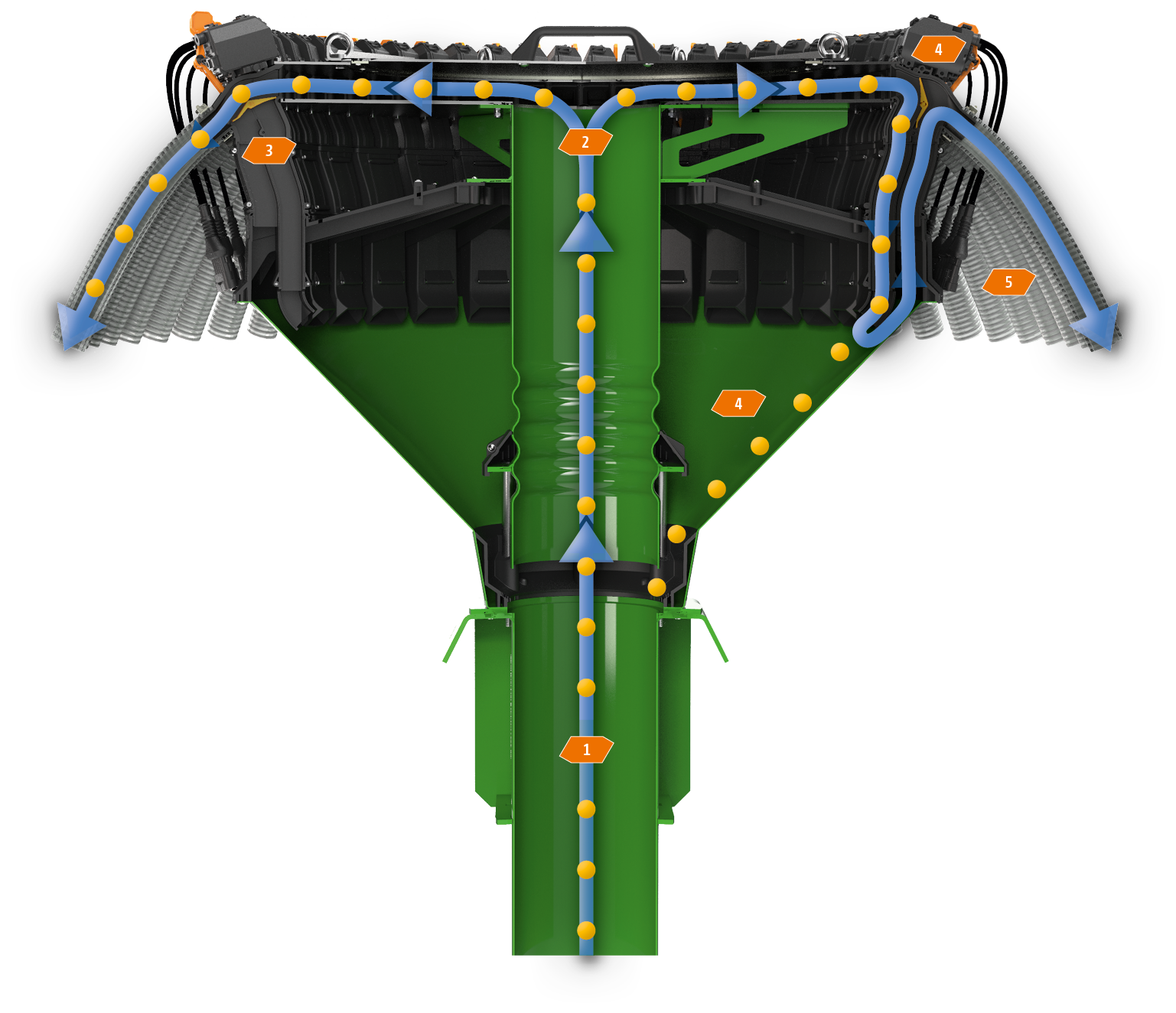 4. Bei geschlossener Klappe werden die Ausbringgüter nach unten umgelenkt, fallen in den Trichter und zirkulieren zurück in den Verteilerkopf. Schließt man Reihen, passt der Dosierer seine Leistung an, damit der Verteilerkopf nicht verstopft.
