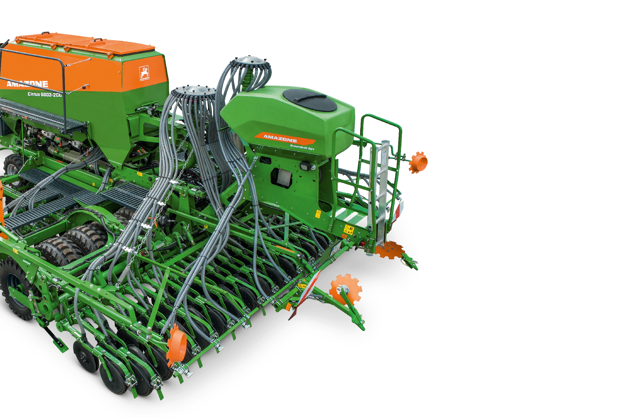 Die Aufbausämaschine GreenDrill ist die Ideallösung für die Saat von Zwischenfrüchten und Untersaaten in nur einem Arbeitsgang. Der über Trittstufen leicht zu erreichende GreenDrill-Saatgutbehälter fasst 500 l. Die ganzflächige Verteilung des Saatgutes erfolgt über Prallteller vor dem Striegel oder über Saatrohre zwischen den Scharen. Alternativ besteht auch die Möglichkeit, das Saatgut über einen zweiten Auslauf am TwinTeC plus-Schar oder Pralltellern hinter dem Schar zu säen.