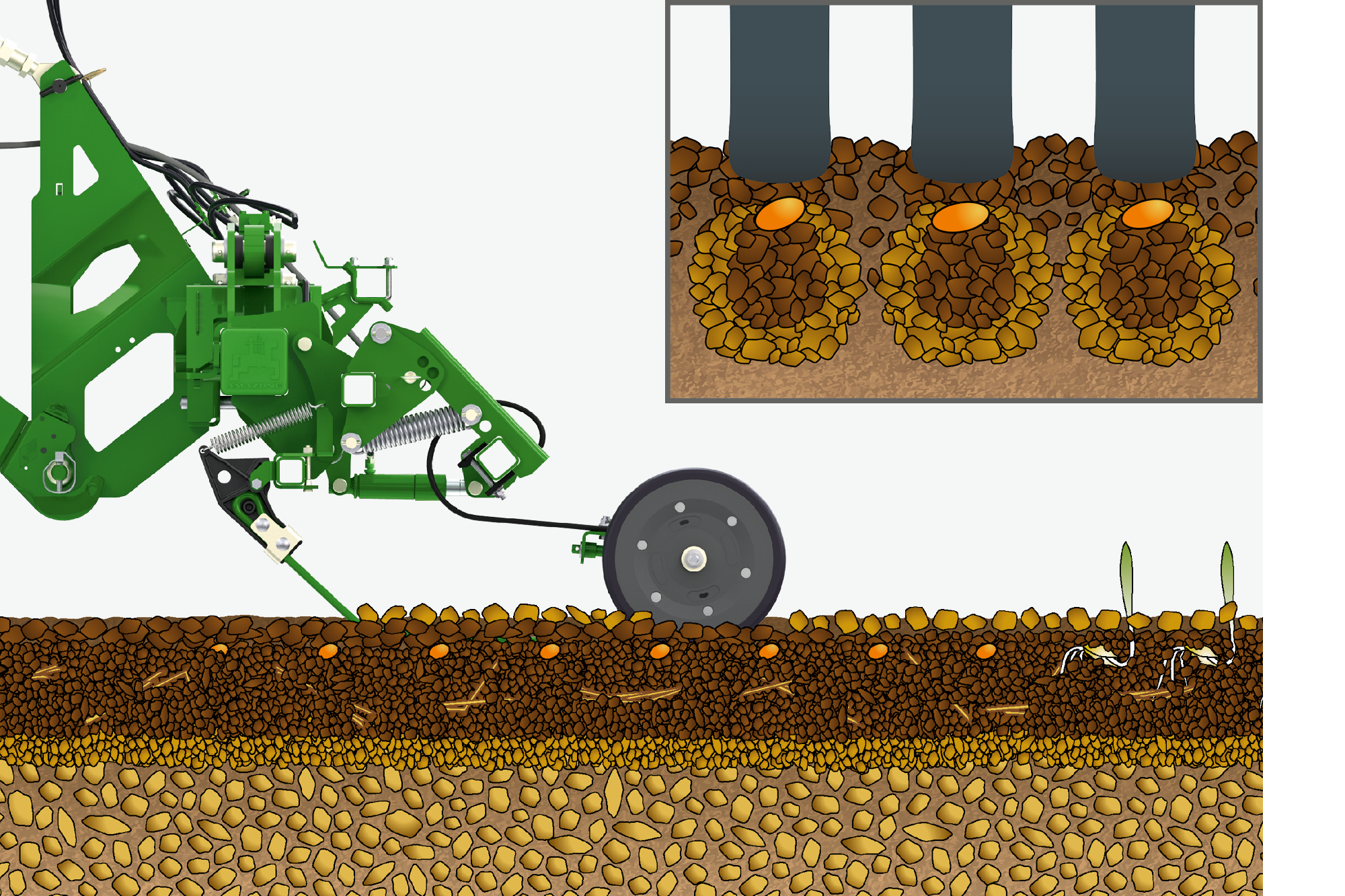 Achtung: Bei heutigen Sämaschinen mit Druck- oder Führungsrollen wird von Praktikern bei feuchten (klebrigen) Bodenverhältnissen empfohlen, diese Rollen abzuschalten, abzubauen oder im angehobenen Zustand (außer Wirkung) zu arretieren. Dies geht aber nur, wenn nicht auch die Tiefenführung an diese Druckrolle gekoppelt ist. Der entscheidende Nachteil anderer Systeme. Dies ist bei der Primera DMC hervorragend gelöst!