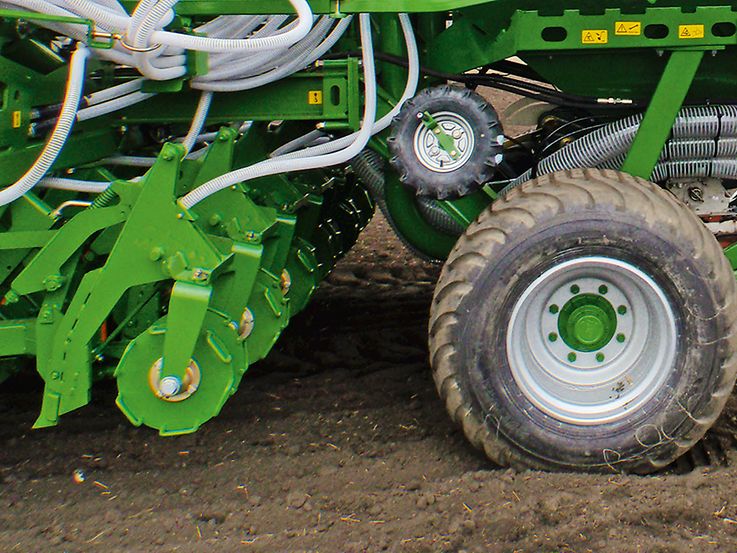 Achtung: Bei heutigen Sämaschinen mit Druck- oder Führungsrollen wird von Praktikern bei feuchten (klebrigen) Bodenverhältnissen empfohlen, diese Rollen abzuschalten, abzubauen oder im angehobenen Zustand (außer Wirkung) zu arretieren. Dies geht aber nur, wenn nicht auch die Tiefenführung an diese Druckrolle gekoppelt ist. Der entscheidende Nachteil anderer Systeme. Dies ist bei der Primera DMC hervorragend gelöst!