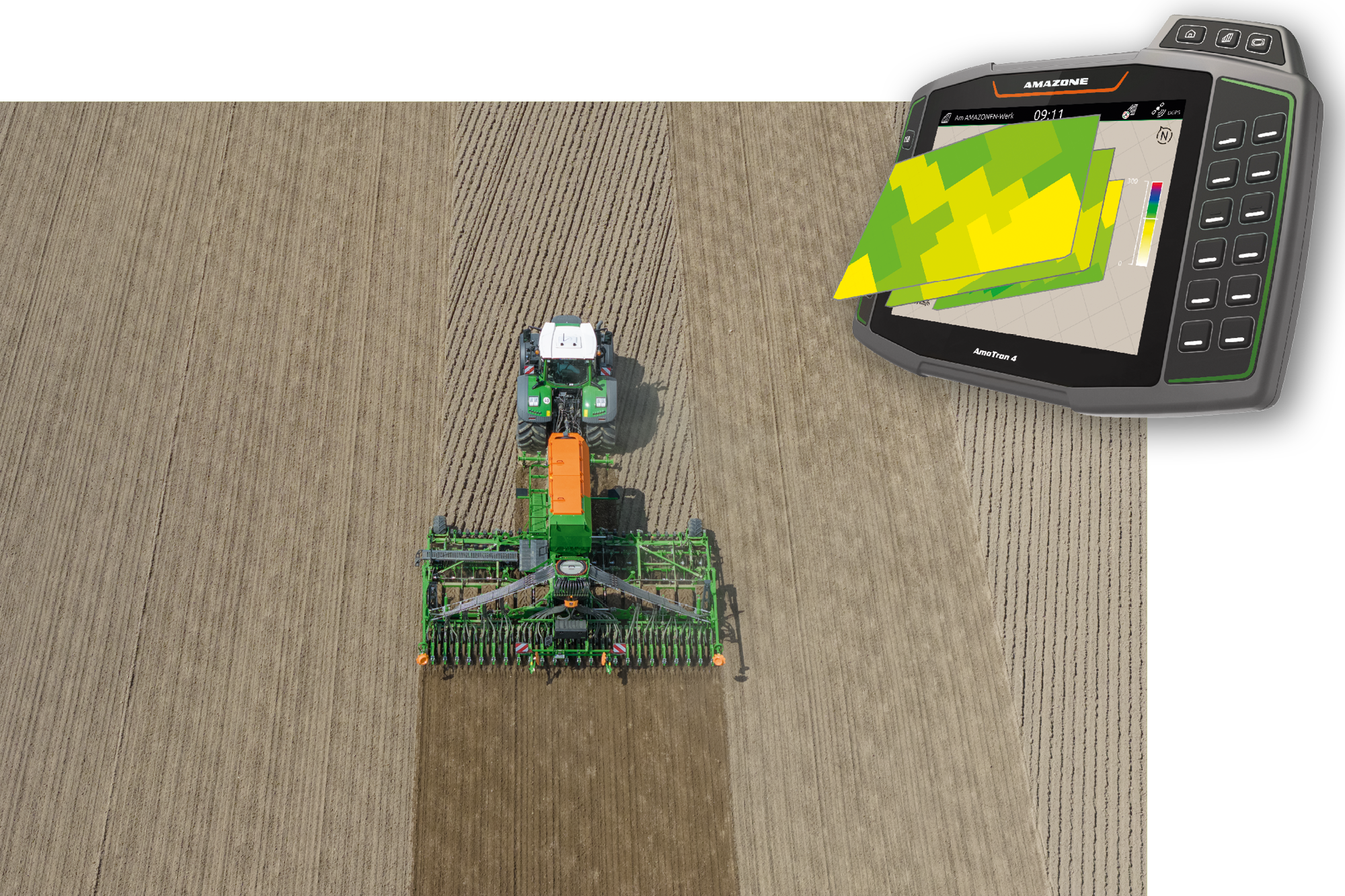 Sowohl Saatgüter als auch Dünger können angepasst an das unterschiedliche Ertragspotenzial innerhalb eines Schlages teilflächenspezifisch in unterschiedlichen Mengen oder unterschiedlichen Schardrücken ausgebracht werden – unabhängig voneinander, auf Grundlage von bis zu 3 Applikationskarten mit der Lizenz GPS-Maps&Docs unter Verwendung des AmaTron 4.