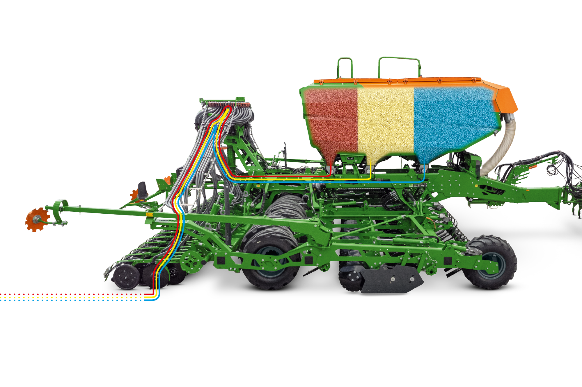 - Mehrkammerbehälter mit bis zu 3 Kammern für verschiedene Saatgüter und Dünger