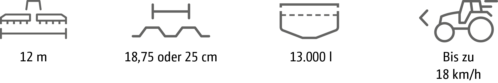 - Sehr großes Behältervolumen mit 4 Kammern, die im Verhältnis 25 : 75 oder 50 : 50 zusammengeschaltet werden können. Die vorderen Kammern 1 und 2 werden über eine gemeinsame Mengenregelung gesteuert, die hinteren Kammern 3 und 4 verfügen über getrennte Mengenregelungen. Jede Kammer hat einen eigenen Dosierer, der die Ausbringung präzise steuert.