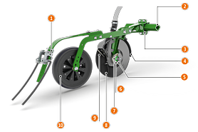 10. Tiefenführungs-/Druckrollen mit 50 mm Breite (Abstreifer optional).
