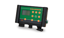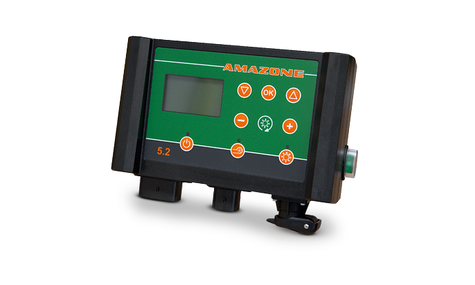 Für die Steuerung der GreenDrill 200 steht der Bedien-Computer 5.2 zur Verfügung. Mit diesem lassen sich die Säwelle und das Gebläse schalten. Zusätzlich steht ein Auswahlmenü zur Unterstützung der Kalibrierung und zur Anzeige der Fahrgeschwindigkeit, der bearbeiteten Fläche und der Arbeitsstunden zur Verfügung. Die Säwellen-Drehzahl passt sich automatisch an wechselnde Fahrgeschwindigkeiten an, sobald der Bedien-Computer an die 7-polige Traktorsignal-Steckdose angeschlossen wird.