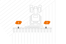 Darstellung einer zweiten Kamera für präzises Arbeiten am Vorgewende. Wenn die erste Kamera (1, serienmäßig links verbaut) am Vorgewende einen anderen Winkel der Kulturreihen erkennt, wird im Vorgewendemodus die aktuelle Einstellung des Reihenführungssystems beibehalten. Alternativ kann eine zweite Kamera (2) rechts installiert werden, welche die Reihenführung bis zum Ende des Keils übernimmt.