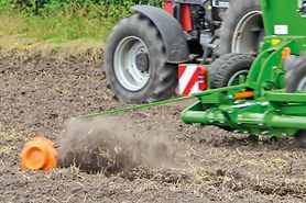 Hydraulikzylinder bringen die Spuranreißer der D9 „Combi“ von der Arbeitsstellung in die senkrechte Ruheposition. Somit kann an Feldrändern gesät oder an Hindernissen vorbeigefahren werden. Beim Umschalten der Spuranreißer zählt die Fahrgassenschaltung weiter, um im gewünschten Rhythmus Fahrgassen anzulegen. Die Spuranreißer sind durch Scherbolzen gegen Beschädigung gesichert.