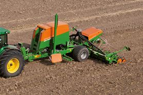 Die gezogene EDX 6000-TC erfordert im Vergleich zu einer angebauten Maschine weniger Hubkräfte am Traktor. Die Einzelkorn-Sämaschine verfügt über einen zentralen Saatgutbehälter mit 600 l Fassungsvermögen, der Düngertank fasst 3.000 l.