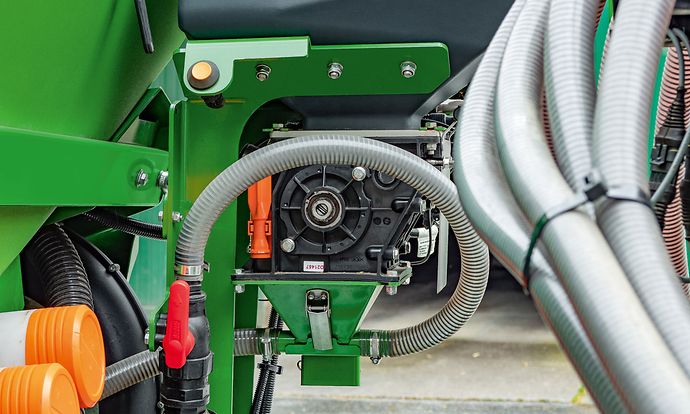 Der Mikrogranulatstreuer Micro plus dient dazu, während der Getreidesaat ein weiteres Fördermedium auszubringen. Der Mikrogranulatstreuer wird direkt am Saatgutbehälter der Säkombination montiert und lässt sich bequem über den Ladesteg erreichen. Die Einfüllöffnung mit einem Durchmesser von 195 mm ermöglicht eine einfache und schnelle Befüllung. Ein weiterer Vorteil des neuen Micro plus ist die separate elektrische Dosiereinheit. Dank der separaten Steuerung des Dosierers kann die gewünschte Saatmenge auf den Hektar genau ausgebracht werden. Zur Dosierung dienen Dosierwalzen aus der pneumatischen Sätechnik von AMAZONE. Das dosierte Fördermedium wird in den Luftstrom der Säkombination abgegeben und über den Verteilerkopf mit dem Saatgut zu den Säscharen transportiert. Die Ausbringung erfolgt im Single-Shoot-Verfahren direkt am Säschar.