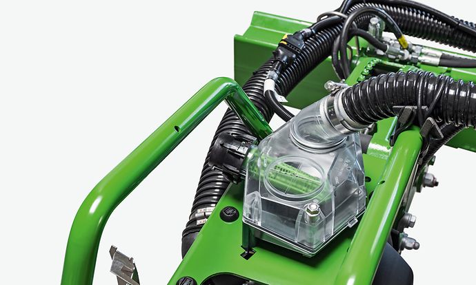 Für besonders hohe Flächenleistungen und zeitsparendes Befüllen verfügt die neue Precea-TCC über einen zentralen Saatgutbehälter, der mit 2.000 l bis zu zwei Bigbags aufnimmt. Mit dem neuen Saatgut-Zuführungssystem Central Seed Supply wird das Saatgut per Luftstrom aus dem zentralen Behälter zu den Vereinzelungsaggregaten geführt. Dort wird das Saatgut je Reihe in einem kleinen Vorratsbehälter zwischengelagert. Ist der maximale Füllstand in dieser Nehmereinheit erreicht, unterbricht automatisch der Luftstrom und damit die weitere Zuführung. Sinkt der Füllstand wieder, startet der Luftstrom automatisch und fördert Saatgut vom Hauptbehälter auf die einzelnen Reihen nach. Durch diese intelligente Luftführung des Central Seed Supply wird jedes Vereinzelungsaggregat unabhängig mit Saatgut versorgt, ohne dass das System eine komplexe Sensorik oder elektronische Steuerung benötigt.