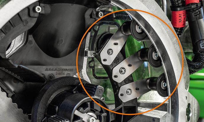 Bei der Saatgutvereinzelung setzt AMAZONE auf seine präzisen PreTeC-Vereinzelungsaggregate, die mit dem Überdruckprinzip arbeiten. Hierbei wird das Saatgut mit Druckluft an die Vereinzelungsscheibe gedrückt. Die Dichtung dreht mit der Vereinzelungsscheibe mit, was für eine deutlich geringere Leistungsaufnahme der elektrischen Einzelreihenantriebe sorgt. Über die automatisch nachregelnde und mit den Optosensoren gekoppelte Abstreiferfernverstellung SmartControl werden Fehl- und Doppelstellen effektiv verhindert. Die elektrisch angetriebene Vereinzelungsscheibe dreht sich abhängig von der Fahrgeschwindigkeit sowie gewünschten Saatmenge und befördert das Saatgut in Richtung Schusskanal. An dieser Stelle wird der Anpressdruck unterbrochen, das Korn präzise in die Säfurche geschossen, von der Fangrolle gestoppt und schließlich sicher platziert.