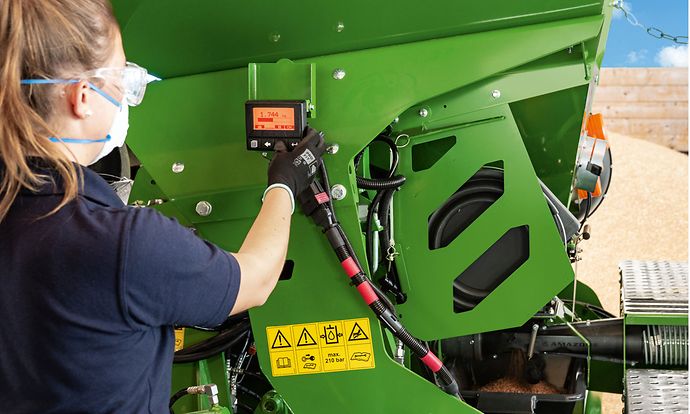 Durch die ebenfalls niedrigere Bauform des Behälters hat der Fahrer eine bessere Übersicht über die Maschine. Die großzügige Befüllöffnung von 2,30 x 0,84 m erlaubt einen raschen und mühelosen Befüllvorgang mit Bigbag, Frontladerschaufel, aber auch per Sackware. Dank spitzem Zulauf und steiler Behälterwände wird das Saatgut sicher zum Dosierer geführt. Außerdem fallen nur geringe Restmengen an.