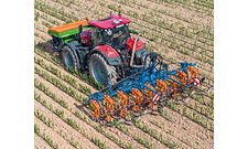 SCHMOTZER Hackmaschine Venterra 2K in Kombination mit dem AMAZONE Frontanbaubehälter FTender 1600 zur Unkrautbekämpfung und Düngung in einer Überfahrt.