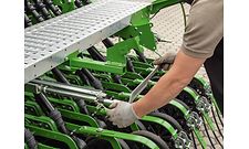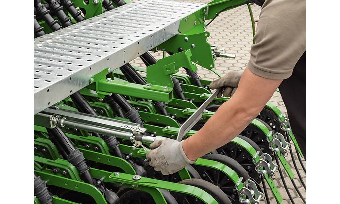Die Schareinstellung der Cataya Special mit dem TwinTeC special-Doppelscheibenschar erfolgt bedienungsfreundlich zentral mit Hilfe des universellen Bedienwerkzeugs am Heck der Maschine. Die Ablagetiefe wird dabei über zwei Sechskantwellen jeweils links und rechts hinter der Maschine eingestellt. Den Schardruck regelt der Fahrer zentral mittig am Maschinenheck über eine Spindel.