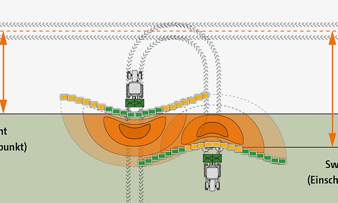 Durch die automatische Schaltung GPS-Switch schaltet der Düngerstreuer am Vorgewende oder in Keilen automatisch sehr präzise ein und aus. In Verbindung mit dem GPS-Switch bietet der sogenannte SwitchPoint die Möglichkeit die Ein- und Ausschaltpunkte in Abhängigkeit des Düngers und der Arbeitsbreite optimal einzustellen. Der sogenannte SwitchOn-Point beschreibt den Einschaltpunkt des Düngerstreuers. Besonders bei großen Arbeitsbreiten befindet sich der Einschaltpunkt schon weit außerhalb des Vorgewendes im Bestand. Der SwitchOff- Point ist der Ausschaltpunkt und beschreibt den Punkt, an dem der zurückgeworfene Streufächer mit entsprechender Überlappung auf die bereits gestreute Fläche des Vorgewendes trifft. Sobald der Ausschaltpunkt erreicht ist, schaltet der Streuer automatisch ab. Die Werte für den Einschaltpunkt und den Ausschaltpunkt werden vorab im Terminal düngerabhängig konfiguriert und können unabhängig voneinander optimiert werden.