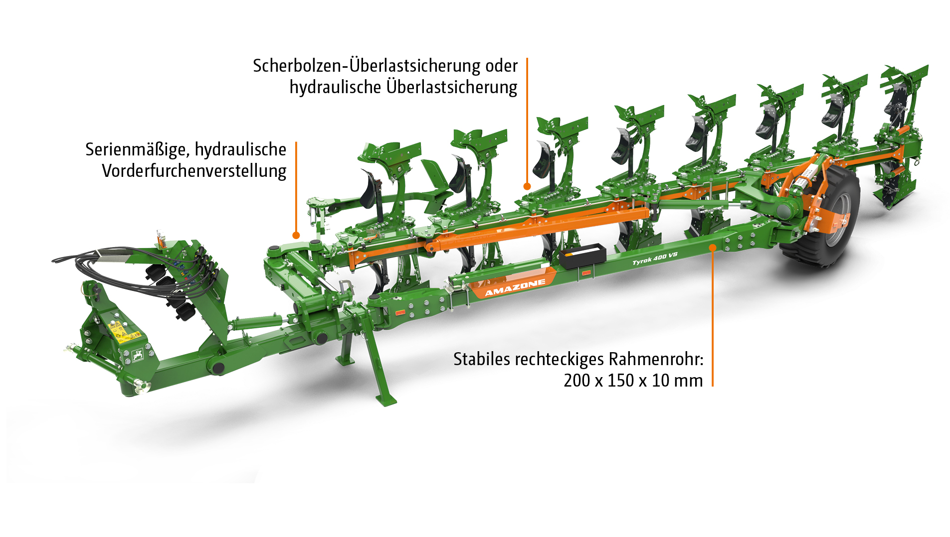 Mit dem schlagkräftigen und sehr robusten Aufsattel-Volldrehpflug Tyrok bietet AMAZONE Ihnen einzigartige Vorteile für Ihren Betrieb. Durch die zweistufige hydraulische Endlagendämpfung SmartTurn wird der Wendevorgang schnell und materialschonend durchgeführt. Gleichzeitig sorgt das neue stabile rechteckige Rahmenrohr für gleichbleibende Arbeitstiefe auf der gesamten Arbeitsbreite.
