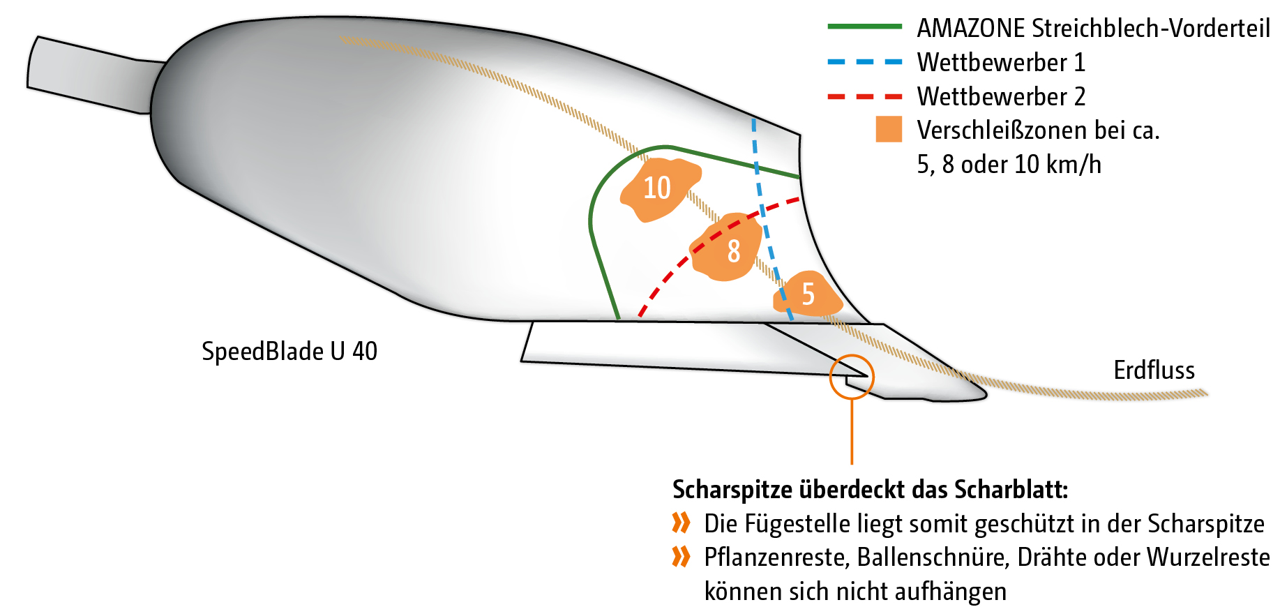 Die neuen innovativen SpeedBlade-Pflugkörper mit patentiertem extra großem Streichblech-Vorderteil und ©plus-Härteverfahren sorgen für deutlich geringeren Verschleiß bei gleichzeitig hohen Fahrgeschwindigkeiten. Durch immer schnellere Fahrgeschwindigkeiten beim Pflügen verlagert sich der Verschleißpunkt weiter nach hinten. Durch das kleine Streichblech-Vorderteil bei handelsüblichen Pflugkörpern beginnt der Verschleiß bei höheren Geschwindigkeiten direkt am Scharblatt. Dank des patentierten vergrößerten Streichblech-Vorderteils reicht es bei AMAZONE aus, das Vorderteil des Streichblechs zu tauschen. Das lästige und teure Tauschen des gesamten Scharblatts wird so vermieden.