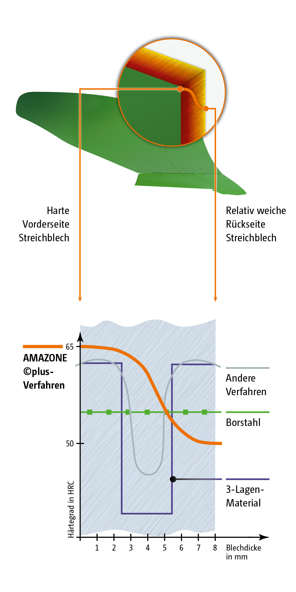 Unser Know-how in der Wärmebehandlung ist die Basis für höchste Qualität der Pflugverschleißteile. Kohlenstoff ist in seiner reinsten Form als Diamant das Härteste, was die Natur hervorbringt. Durch zusätzliches Einbringen von Kohlenstoff werden die ©plus-Verschleißteile weitaus härter und langlebiger. AMAZONE erreicht mit einem einzigartigen Härteverfahren z. B. beim Streichblech eine sehr große Härte an der Vorderseite, was beste Verschleißfestigkeit bedeutet. Die Rückseite bleibt relativ weich und damit auch überaus zäh und schlagfest.