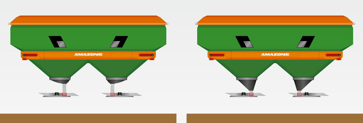 Eine exakte Düngerverteilung über die gesamte Arbeitsbreite ist die Basis für eine homogene und ressourceneffiziente Bestandesführung sowie für die Nutzung des vollen Ertragspotentials. In der Ebene stellt dies für die heutige Technik keine Schwierigkeit dar. In extremen Hanglagen hat die Topografie einen wesentlichen Einfluss auf den Streufächer und somit auf die Düngerverteilung in der Fläche. Um diesem Effekt entgegen zu wirken, bietet AMAZONE für die Düngerstreuer ZA-V ein einfaches und zu gleichzeitig effizientes Hangstreuset an.