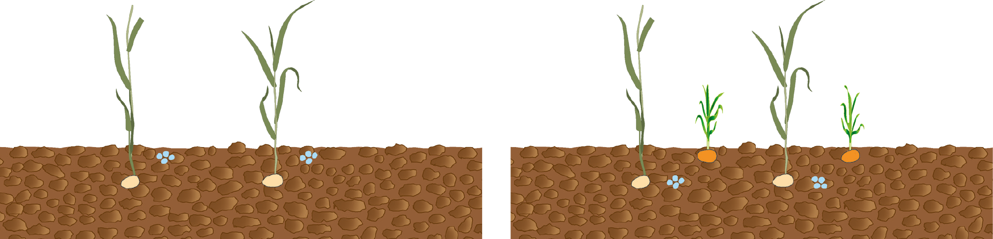 In Verbindung mit dem TwinTeC-Doppelscheibenschar besteht sogar die Möglichkeit, zwei unterschiedliche Saatgüter oder Saatgut und Dünger im Double-Shoot-Verfahren an zwei verschiedenen Abgabepunkten zu applizieren. Dabei wird das erste Medium über das TwinTeC-Schar im Boden abgelegt und das zweite Fördergut über eine separate Förderstrecke zu einem zusätzlichen Auslauf am TwinTeC-Schar geleitet und vor der Tiefenführungsrolle im Boden platziert. Durch diese abgesetzte Platzierung kann beispielsweise Dünger gezielt für eine ganzheitliche Versorgung der Pflanze eingesetzt werden.