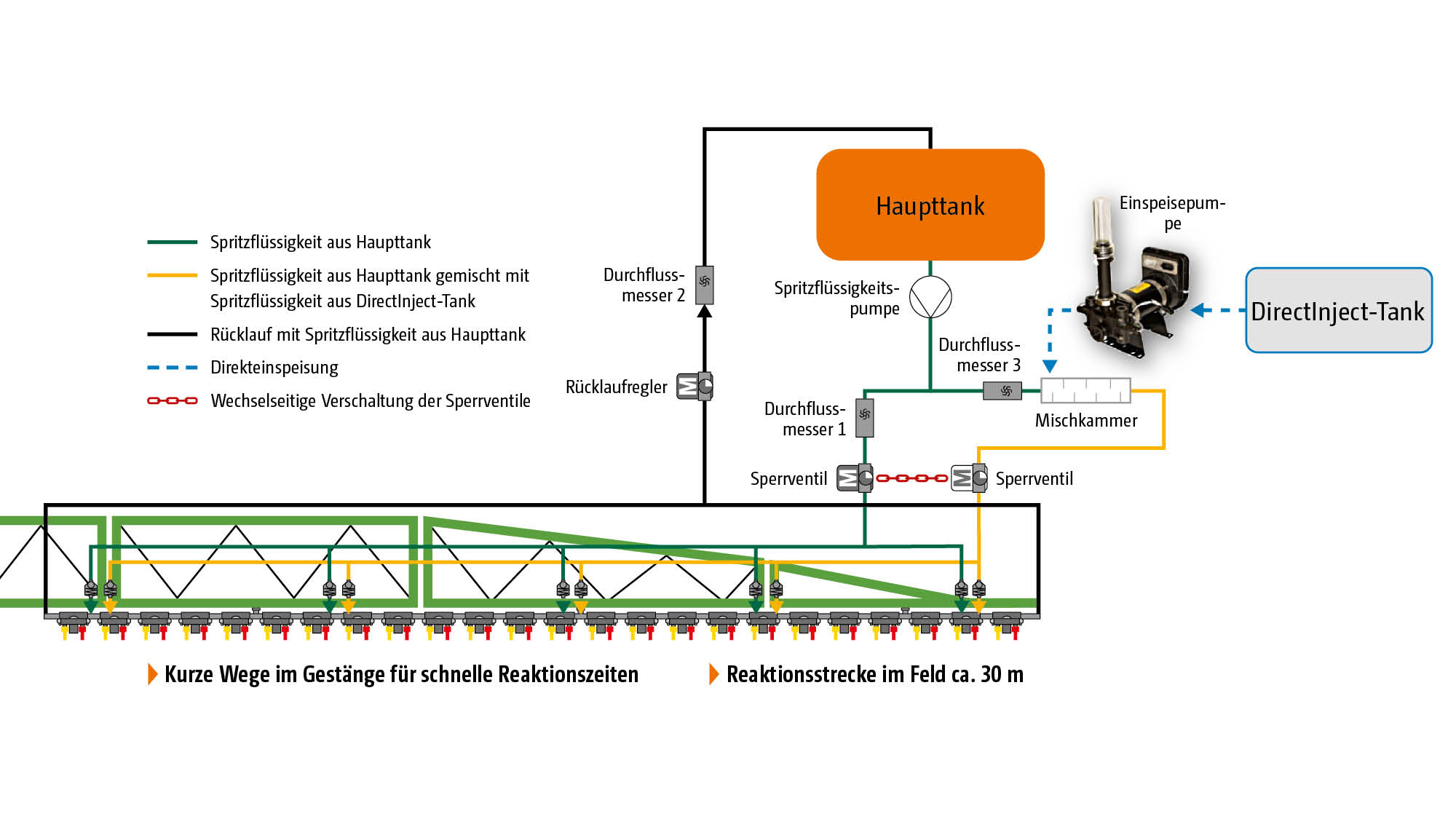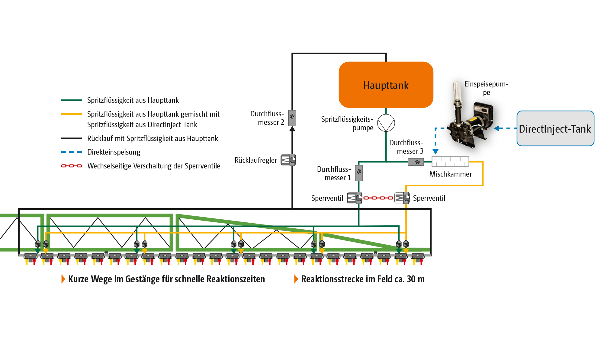 Diese kurzen Wege der Flüssigkeit direkt im Gestänge führen zu kurzen Reaktionszeiten auf dem Feld. Durch die Hochdruck-Zirkulation DUS pro zirkuliert die Spritzflüssigkeit in der Spritzleitung immer mit dem eingestellten Spritzdruck, auch wenn die Düsen geschlossen sind. Bei Aktivierung der Direkteinspeisung wird diese Zirkulation geschlossen, so wird die Spritzflüssigkeit aus dem Spritzflüssigkeitstank nicht mit dem Produkt aus dem DirektInject-Tank vermischt.