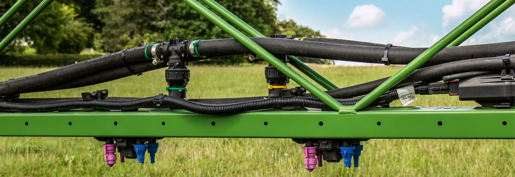 Stellt der Fahrer der Feldspritze z. B. auf einer Teilfläche fest, dass dort ungewünschte Beikräuter zu bekämpfen sind, kann er per Knopfdruck von der Kabine aus die Dosierung von DirectInject aktivieren. Zur Spritzflüssigkeit aus dem Spritzflüssigkeitstank wird dann das zusätzliche Produkt aus dem DirectInject-Tank in die Mischkammer, die ebenfalls in das Ablagefach integriert ist, zudosiert. Die gegenüber konventionellen Systemen optimierte Reaktionszeit wird dabei durch ein Zweileitungssystem umgesetzt. In einer zweiten Spritzleitung im Gestänge liegt eine vorgemischte Spritzflüssigkeit aus dem Spritzflüssigkeitstank und dem Pflanzenschutzmittel aus dem DirectInject-Tank direkt an. Bei Aktivierung der Direkteinspeisung wird das Gemisch dann über mehrere Einspeisestellen im Gestänge durch die Düsenkörper und Düsen ausgebracht. Hierzu sind das Ventil für die Spritzflüssigkeit aus dem Spritzflüssigkeitstank und das Ventil für die zweite Spritzleitung mit dem vorgemischten DirectInject-Mittel wechselseitig geschaltet, sodass immer nur aus einer Leitung Spritzflüssigkeit entnommen wird.