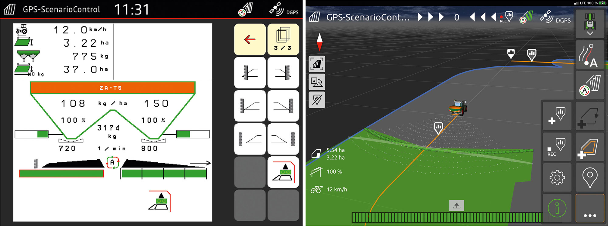 Bei erstmaliger Feldüberfahrt mit dem Düngerstreuer werden beispielsweise vom erfahrenen Betriebsleiter mit dem System GPS-ScenarioControl alle Schaltpunkte sowie die Fahrtroute und Fahrtrichtung nach Betätigen der record-Taste automatisch aufgezeichnet. Die Schaltpunkte werden übersichtlich auf der Karte markiert und die Fahrtrichtung durch Richtungspfeile visualisiert. Beim Düngerstreuer liegen die Streumodi Grenz, Graben- und Randstreuen sowie das einseitige Streuen in das Feldinnere am Vorgewende (HeadlandControl) im Fokus. GPS-ScenarioControl ist im ISOBUS-Bedienterminal AmaTron 4 integriert und lässt sich über die Displayerweiterung AmaTron Twin abbilden und bedienen.